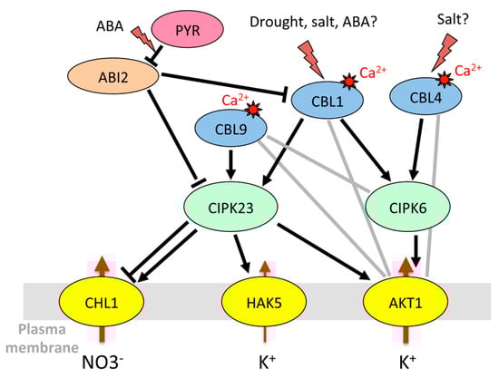 Model for cross-talks between CIPK (CBL-interacting protein kinase)/CBL (Calcineurin B-like protein) regulations of K+ and NO3− uptake by Arabidopsis roots, obtained by compilations of expression and interaction data. Positive and negative regulations are depicted in black (arrows and T-bars, respectively). Indications for physical interactions (two-hybrid, bimolecular fluorescence complementation (BiFC)) in the absence of further evidence for functional effect are represented by a gray line. Red arrows symbolize the ion fluxes. The lightning symbol is used when a stress or abscisic acid (ABA) results in a change in protein amount, protein activity or protein-protein interaction. The symbol “?” stresses that the effects of the treatments on CBL1 protein accumulation [] were only addressed in whole leaves. Also, myristoylation of CBL4 is required for its function in salt resistance [], but was not demonstrated to occur in response to salt. References: “drought, salt, ABA?” to CBL1 [,]; “salt” to CBL4 []; ABI2 to CIPK23 and CBL4 []; CBL1 to CIPK6 [,], CBL1 and CBL9 to CIPK23 [,,]; CBL4 and CBL9 to CIPK6 []; CIPK6 to AKT1 [,]; CIPK23 to AKT1 [,]; CBL1, CBL4 and CBL9 to AKT1 []; CIPK23 to HAK5 []; CIPK23 to CHL1 []. The phosphatase AtPP2CA, mainly expressed in phloem tissues [], and not characterized for its role in root ion uptake, was not included in this figure.
