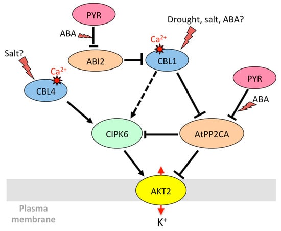 AtPP2CA is a negative regulator of ABA signaling [,] selectively interacting with some PYR/PYL/RCAR receptors []. Interestingly, the phosphatase changed the rectifying properties of the channel by preferentially inhibiting the leak component []. Later on, Michard et al. [] revealed that phosphorylation is essential to the functioning of AKT2, by activating silenced AKT2 channels and promoting the switch to the non-rectifying, leaky mode. To date, the kinase(s) that phosphorylate AKT2 remain unidentified. Instead, the CIPK6/CBL4 couple was found to strongly activate AKT2 in a calcium-dependent but phosphorylation-independent manner, by promoting the targeting of the AKT2/CIPK/CBL complex to the plasma membrane through myristoylation of CBL4 []. Plants overexpressing CIPK6 are more sensitive to ABA and more tolerant to salt stress []. CBL4, also known as SOS3 (salt overly sensitive 3), is essential for salt resistance and potassium homeostasis []. Thus, regulation of AKT2 by CIPK6 and CBL4 could take part in adaptation to salt stress. A receptor-like pseudokinase, MRH1 (morphology of root hair 1), also interacts with AKT2, but has no direct functional effect. It is proposed to be involved in the recruitment of other, still unknown, partners [].