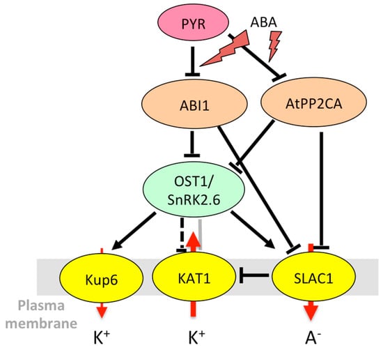 ABA perception by PYR/PYL/RCAR (pyrabactin resistance, pyrabactin resistance-like, regulatory component of ABA receptor) ABA receptors triggers an increase in cytoplasmic calcium (due to release from internal stores and Ca2+ uptake, regulated by ROS and nitric oxide [,,,]) leading to activation of anion channels (slow- and quick-activating SLAC1 (slow anion channel 1), SLAH3 (SLAC1 homolog), and QUAC1 (quick anion channel 1)) [] that depolarize the plasma membrane. The plasma membrane depolarization, in turn, triggers the opening of the K+ voltage-gated GORK channel that mediates K+ efflux [,]. This release of ions drives water out of guard cells, which causes guard-cell deflating and stomatal closure [,]. In addition to GORK, KUP6 and KUP8 are also involved in the control of stomatal closure. KUP6 is highly responsive to osmotic stress, especially in shoots [,]. KUP6 over-expressors exhibit a clear drought resistance phenotype, thus highlighting the importance of the KUP6 gene in stress adaptation, and close their stomata more efficiently than wild-type plants in the presence of ABA []. Shaker genes KAT1/KAT2, AKT1, GORK, and, to a much lesser extent. AKT2 and AtKC1 are expressed in guard-cell protoplasts [,,]. KAT1 and KAT2 encode inward-rectifying-forming subunits that, after tetramerization, form the KAT1 and KAT2 channels, which are the key actors of stomatal opening. Stomatal opening mechanism is an inversion of stomatal closure in terms of osmolyte accumulation and direction of fluxes. KAT1 and KAT2 mediate K+ influx that drives water influx and opens stomata []. Upon ABA exposure, KAT1 and KAT2 genes are downregulated at the transcriptional level, as expected for genes involved in stomatal opening [,]. The GORK gene transcription, which is clearly upregulated by ABA in most tissues [] was unexpectedly found insensitive (or weakly sensitive) to ABA in guard-cell protoplasts [,], thus revealing a specific type of regulation for these cells. AKT1, previously found to be essential for root K+ uptake [], was only recently identified as a player of stomatal movements. In the akt1 loss-of-function mutant, the stomatal conductance is lower under drought stress and ABA has a much stronger effect on stomatal closing [].