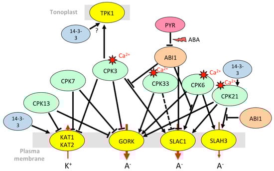 Like OST1, kinases of the CPK family, activated by calcium, also interact with SLAC1 and SLAH3 to modulate anion efflux in guard cells. CPK21 and CPK23 both activate SLAC1 and SLAH3 in an ABA-and ABI1-dependent manner, but with contrasting effects on channel currents and calcium sensitivity [,,]. In the cpk3 cpk6 double knock-out mutant, Ca2+- and ABA-activated S-type anion channel currents are abolished, and stomatal closure is partially impaired []. Accordingly, CPK6 was found to activate SLAC1 in Xenopus oocytes and to phosphorylate the SLAC1 N-terminus at a much higher speed than CPK23 and OST1 []. CPK21 [] and CPK3 [] also activate SLAC1 in oocytes, but only in their truncated, constitutively active form, suggesting that they are weakly sensitive to calcium and operate only in response to an increase in cytosolic calcium. Contrary to CPK3, CPK6, CPK21 and CPK23, which activate SLAC1 and SLAH3, CPK33 counteracts ABA-dependent slow anion channel activation in guard-cell protoplasts []. Finally, it is interesting to note that the CIPK23/CBL1 complex, already known to regulate the K+ channel AKT1 and the high-affinity transporter HAK5, also interacts with and activates SLAC1 and SLAH3. Like CPK23, it phosphorylates the N-terminus of SLAC1 in a calcium-dependent manner, but there exist specificities for target phosphorylation sites [].