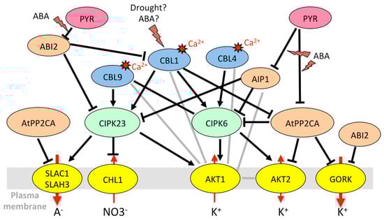In the nitrate transporter family, CHL1 (NRT1.1/NPF6.3) (chlorate-resistant 1, nitrate transporter 1, NRT1/PTR family 6.3), involved in root NO3− uptake [], is also targeted by the same kinases and phosphatases. Under low-nitrate conditions, CIPK23/CBL9 phosphorylates CHL1, and converts it into a high-affinity nitrate transporter. However, when nitrate level is high, the transporter returns to the low-affinity state and the CIPK/CBL complex inhibits nitrate transport through CHL1 []. CBL1 also associates with CIPK23 to decrease NO3− uptake under high external nitrate in Xenopus oocytes []. This inhibitory effect is reversed by the clade A PP2Cs ABI1 and ABI2 []. In addition to its role in NO3− uptake, CHL1 is also involved in stomatal opening and plant drought susceptibility []. CIPK23 and CBL1 are both expressed in guard cells []. Since the CBL1 protein level is enhanced in response to ABA or osmotic stress (Table 2), the inhibition of CHL1 by the CIPK23/CBL1 complex could be a means to control anion influx that would counteract stomatal closure.
