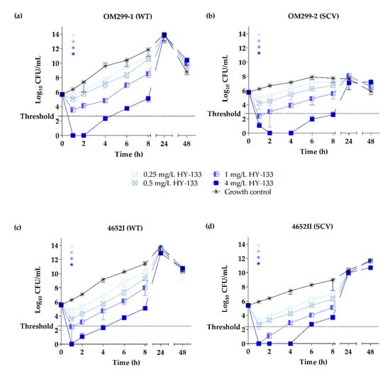 Time-kill curves of HY-133 shown by plots of mean values for the log10 of the numbers of CFU/mL versus time for two representative clinical Staphylococcus aureus WTs (a,c) and corresponding SCVs (b,d) tested against HY-133. The threshold implicates a ≥3 − log10 decrease in CFU/mL. Time-kill curves for each strain were performed in triplicate (mean ± standard deviation). Asterisks denote statistical difference of the respective concentration of HY-133 used (defined by matching colors) with respect to the untreated growth control at 1 h; p ≤ 0.001 by one-way ANOVA.