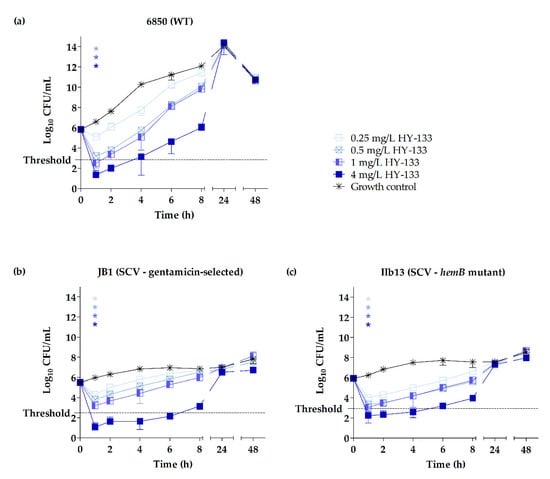 Time-kill curves of HY-133 shown by plots of mean values for the log10 of the numbers of CFU/mL versus time for the highly cytotoxic and clinically virulent S. aureus WT strain 6850 (a) and corresponding SCVs JB1 (b) and IIb13 (c) tested against HY-133. The threshold implicates a ≥3 − log10 decrease in CFU/mL. Time-kill curves for each strain were performed in triplicate (mean ± standard deviation). Asterisks denote statistical difference of the respective concentration of HY-133 used (defined by matching colors) with respect to the untreated growth control at 1 h; p ≤ 0.001 by one-way ANOVA.