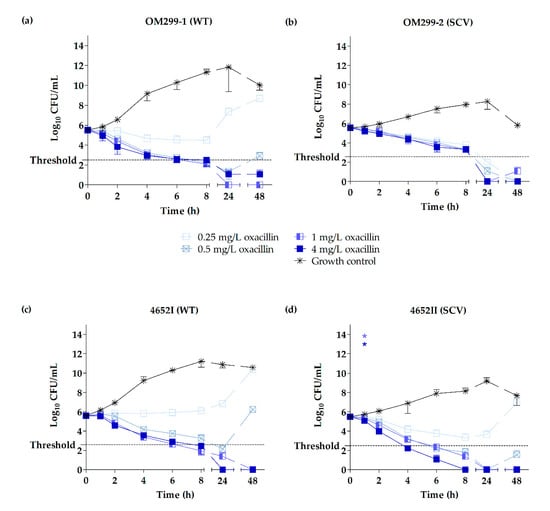 Time-kill curves of oxacillin shown by plots of mean values for the log10 of the numbers of CFU/mL versus time for two representative clinical S. aureus WTs (a,c) and corresponding SCVs (b,d) tested against oxacillin. The threshold implicates a ≥3 − log10 decrease in CFU/mL. Time-kill curves for each strain were performed in triplicate (mean ± standard deviation). Asterisks denote statistical difference of the respective concentration of oxacillin used (defined by matching colors) with respect to the untreated growth control at 1 h; p ≤ 0.001 by one-way ANOVA.