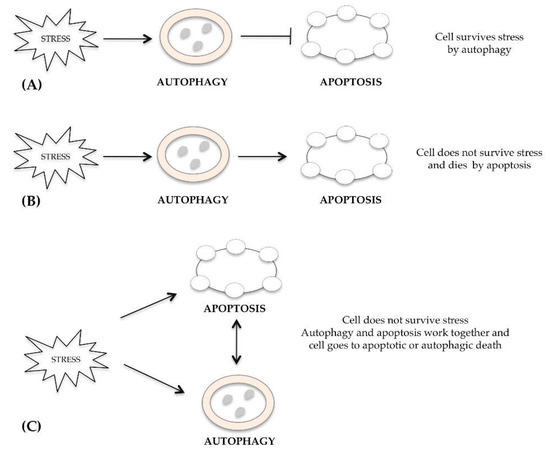 Cross-talk between autophagy and apoptosis. (A) After stress signal, cells survive by activating the autophagic pathway, which blocks death by apoptosis; (B) Alternatively, the autophagic mechanism fails and cells dies by apoptosis; (C) Damage activates both autophagy and apoptosis, which work together; cell does not survive, but dies.