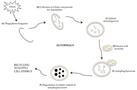 Autophagy is a dynamic and multi-phase process, as described in Figure 2; when a cell is undergoing autophagy, a small double layer membrane (phagophore) is formed (Figure 2A), which begins to wrap the organelles and/or the macromolecules to be eliminated (Figure 2B). This membrane closes, forming the autophagosome, i.e., a double membrane vacuole (Figure 2C). The autophagosome merges with the lysosome (Figure 2D) to form the autophagolysosome (Figure 2E), in which the hydrolytic lysosomal enzymes digest the inner membrane of the vacuole and the autophagosomal content (Figure 2F). The macromolecules released can be used for biosynthesis or to supply cellular energy [19].