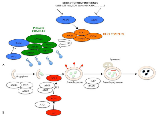 When nutrients are available, the mammalian target of rapamycin (mTOR) and protein kinase A (PKA) negatively regulate autophagy through the phosphorylation and inhibition of the induction complex, called unc-51-like kinase 1 (ULK1) complex [23]. When nutrients are scarce, different chemical mediators are released by stress as AMP-ATP ratio rises, there is elevated production of reactive oxygen species (ROS), nicotinamide adenine dinucleotide (NAD+) increases, there is inhibition of mTOR activity, and switch-on of AMP-activated protein kinase (AMPK), initiating the autophagic machinery (Figure 3). The induction phase of phagophore formation is mediated by the ULK1 complex, which includes ULK1, ATG13, focal adhesion kinase family interacting protein of 200 kDa (FIP200), and ATG101 protein [24]. Consequently, the ULK1 complex, no longer phosphorylated by mTOR but phosphorylated by AMPK, acts on the complex that regulates autophagosome nucleation [25]. It is able to activate the phosphatidylinositol 3-kinase complex (PtdIns3K) formed by Beclin1, ATG14, vacuolar protein sorting (VPS)15, VPS34, activating molecule in BECN1 regulated autophagy protein 1 (AMBRA1), and ultraviolet irradiation resistance-associated gene (UVRAG) (Figure 3A) [26]. The induction of this kinase complex generates the lipid phosphatidylinositol-3-phosphate (PI3P), which in turn recruits other proteins essential for the formation of vacuoles (such as the WD-repeat protein interacting with phosphoinositides (WIPI) protein, which is able to interact with the phospholipids) [27].