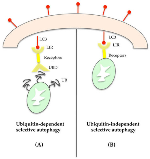 Organelles can be selectively degraded through ubiquitin-dependent or -independent mechanisms [40]. In the first case, the target organelle has a polyubiquitinated chain that directs it towards substrate-specific receptors such as p62, the neighbor of BRCA1 gene 1 (NBR1), nuclear domain 10 protein 52 (NDP52), and optineurin [41,42,43,44]. These proteins act as molecular adaptors, as they are able to recognize and bind, on one side, the polyubiquitinated chain (UB) on damaged organelles through UB-binding domain (UBD), and on the other, the LC3-II protein in the autophagosome through LC3-interacting regions (LIR) (Figure 4A). Thus, aside from its role in the autophagosome expansion, LC3-II also plays an essential role in cargo selection.