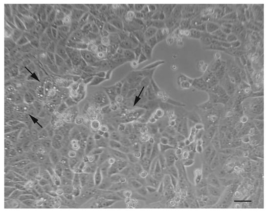 Optical microscopic observation of autophagic tumor cells after treatment with natural compound. As indicated by arrows, there are visible holes inside the cytoplasm. Scale bar: 20 μm.