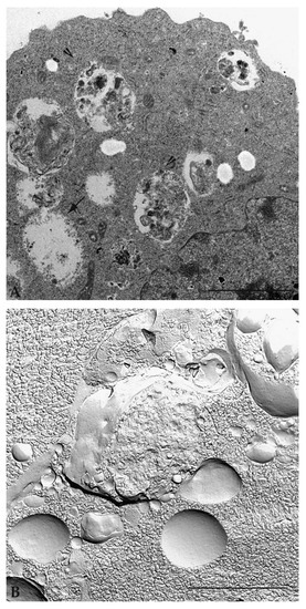 Detailed analysis of the same sample with a transmission electron microscope shows cytoplasmic vacuoles with single and double membranes, containing cytoplasmic organelles and material to be digested and recycled (Figure 6A). Observation of samples prepared following the standard inclusion procedures allows the different phases of the autophagic vacuole formation and maturation (initiation, nucleation, phagophore formation, autophagosome, fusion of autophagosome with lysosome and autophagolysosome) to be defined [53]. If the samples are prepared using a rapid freezing technique with plasma membrane fracture (known as freeze-fracturing technique), a deep understanding of the vacuolar molecular membrane organization is obtained (Figure 6B).