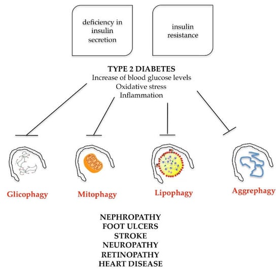 The progression of type 2 diabetes is associated with autophagy through insulin secretion deficiency and the development of insulin resistance [73]. Autophagy has a protective role against pancreatic beta cells, preserving their structure and function and defending them from apoptotic cell death. In addition, selective autophagic mechanisms, such as lypophagy, aggrephagy, mitophagy and glycophagy, protect the insulin target organs (liver, adipose tissue, skeletal muscle, kidneys) from oxidative stress damage derived by hyperglycemia. Hence, multiple autophagy mechanism alterations modify the metabolism and the cellular balance, favoring the establishment of pathological situations such as diabetes, obesity and the cardiovascular complications [74].