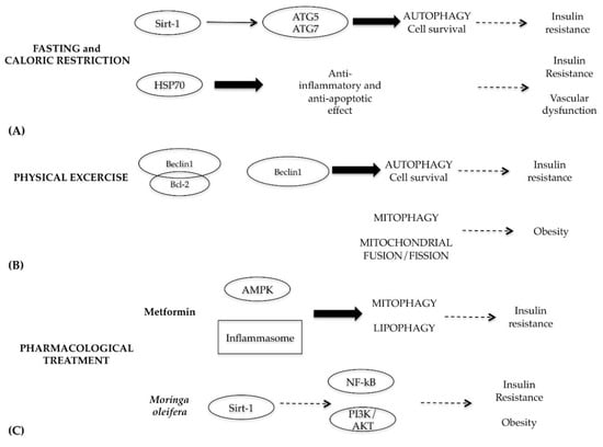 Schematic representation of autophagy modulation by fasting and caloric restriction, physical exercise or pharmacological treatment. (A) Fasting and caloric restriction acts on Sirt-1 and HSP70 proteins with autophagic and anti-apoptotic effect, respectively; (B) Physical exercise induces autophagy, disrupting the Beclin1 and Bcl-2 complex and balancing mitochondrial fusion/fission; (C) Treatments with Metformin or natural extract by Moringa oleifera restore mitophagy and lipophagy.