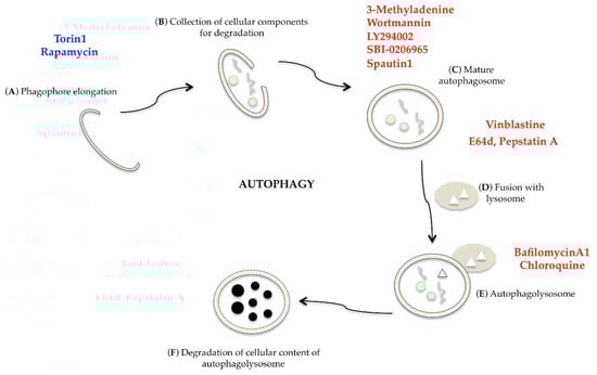 In recent years, many compounds able to induce or inhibit autophagy have been identified for pharmacological intervention, but their use must be widely supported by preclinical data [124]. Torin1, a potent and selective inhibitor of mTOR, and Rapamycin, an mTORC1 inhibitor, are able to stimulate autophagy [125]. Autophagy is inhibited at multiple levels by 3-methyladenine, LY294002, Wortmannin (PI3K specific inhibitors), SBI-0206965 (ULK1 inhibitor), Spautin1 (inhibitor of UB-specific peptidase), Vinblastine (blocks the fusion between lysosome and autophagosome), E64d and Pestatin A (lysosomal protease inhibitors), Bafilomycin A1 (ATPase pump inhibitor), and Chlorochine (a lysosomotropic compounds that interferes with autophagosome degradation) (Figure 9) [124,126].