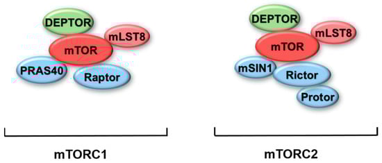 mTORC1 contains mTOR, mammalian lethal with SEC13 protein 8 (mLST8), DEP (DVL, Egl-10, pleckstrin)-domain containing mTOR-interacting protein (DEPTOR), proline-rich Akt substrate of 40 kD (PRAS40), and regulatory associated protein of mammalian target of rapamycin (Raptor) (Figure 1) [6,7,8,9,10]. In this complex, mTOR-combined DEPTOR and PRAS40 can negatively regulate mTORC1 activity [6,10]. mTORC1 plays a key role in regulating cell growth, cell size, and proliferation [8,11,12]. mTORC1 is a core component in a series of signaling networks. Additionally, it senses different stimuli such as insulin level, energy level, and amino acid level, and is involved in protein synthesis, lipid metabolism, glycolytic metabolism, and autophagy [13,14].