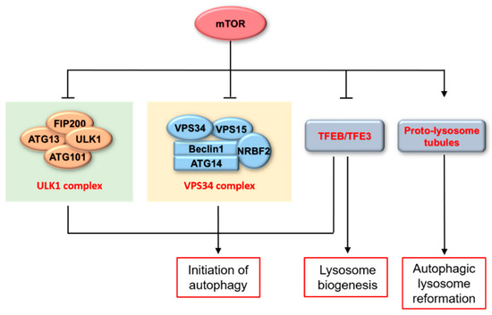 Autophagy is an evolutionarily conserved turnover process that exerts great importance on the clearance of long-lived proteins, aggregated protein, or dysfunctional organelles, and provides energy and macromolecular precursors in return [33]. Autophagy has been widely divided into three sorts: macro-autophagy, micro-autophagy, and chaperone-mediated autophagy [34,35]. The term “autophagy” in this review refers to macro-autophagy. The process of autophagy includes initiation, nucleation, elongation, and formation of a double-membrane autophagosome, followed by the fusion of the autophagosome with a lysosome to form autolysosomes to degrade and recycle autophagosome-sequestered substrates [33]. It has been reported that mTOR plays a complex role in the induction, process, and termination of autophagy. Here, we will briefly summarize several key mTOR-related pathways that regulate autophagy activity.