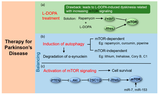 mTOR plays an important role in regulating neuronal functions and autophagy. Given the importance of mTOR, targeting mTOR is a potentially effective therapeutic target for PD (Figure 3). In terms of therapy of PD, it is crucial to accelerate the clearance of aggregated toxic proteins in neurons. Autophagy is a key pathway for promoting degradation of α-synuclein; thus, enhancing autophagy flux seems to be an effective way for PD treatment. As the central role of mTOR in autophagy regulation, mTOR-dependent autophagy enhancers hold great promise for PD treatment. As such, on the one hand, inhibiting mTOR signaling appears to be a viable treatment strategy. On the other hand, maintaining a certain level of mTOR activity is necessary because mTOR signaling is essential for cellular survival and growth. Importantly, mTOR regulates multiple essential cellular functions including synaptic plasticity, memory formation, and retention in neuronal cells [96,97]. Too much or too little mTOR activity could be fatal to neurons. A balance between activation of mTOR signaling and enhancement of autophagy needs to be accurately managed, which may offer exciting new avenues for the development of therapeutic strategies for PD. Though targeting of the mTOR pathway has shown neuroprotective actions in a variety of in vivo and in vitro PD models, the therapeutic potential of mTOR inhibitors (such as to enhance autophagy by inhibiting mTOR) may be limited because mTOR regulates multiple cellular functions. Additionally, mTOR inhibitors, such as rapamycin, may have some side effects in clinical trials [114,115]. For example, rapamycin has been applied in treating patients with lymphangioleiomyomatosis, leading to some rapamycin levels-associated side effects, like apthous ulcers, nausea, and diarrhea [114]. Thus, the dosage of mTOR inhibitors in clinical trials should be continuously modified during the treatment period [114]. Although several fundamental questions need to be further addressed before these novel mTOR-targeting reagents could be applied in clinical trials, the research field of mTOR is developing quickly and clinically relevant updates on mTOR modulators may arise soon.