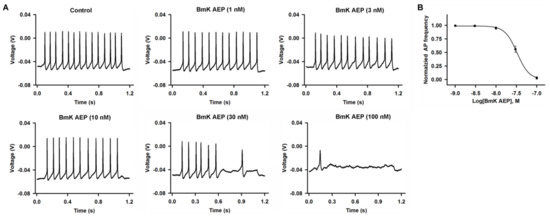 BmK AEP has been shown to display anti-epileptic activity in a coriaria lactone-induced epileptic model in rat [14]. We therefore evaluated the effect of BmK AEP on neuronal excitability in primary cultured cortical neurons. The APs were elicited by injection of a 30-pA current. Bath application of BmK AEP concentration-dependently suppressed the AP firing frequency (Figure 1). At concentrations of 3 and 10 nM, BmK AEP displayed negligible effects on AP firing. However, at higher concentrations (30 and 100 nM), BmK AEP significantly suppressed AP firing. The IC50 value for BmK AEP suppression of AP firing is 33.1 nM (95% confidence interval (95% CI): 21.6–57.2 nM).