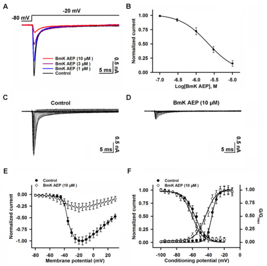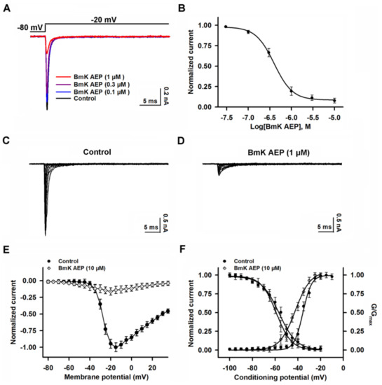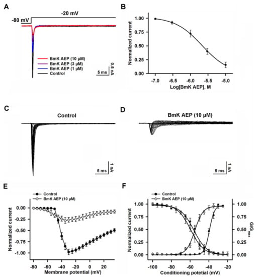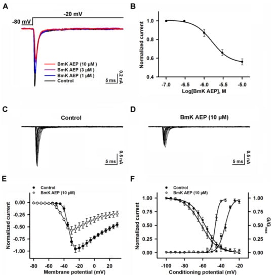 Influence of BmK AEP on hNav1.1 expressed in HEK-293 cells. (A) BmK AEP suppressed the Nav1.1 peak current. Nav1.1 currents were elicited by a 50-ms depolarization to −20 mV from a holding potential of −80 mV. (B) Concentration–response relationships of BmK AEP inhibition on Nav1.1 currents. (C,D) Representative traces of Nav1.1 currents in the absence and presence of 10 µM BmK AEP, respectively. Currents were evoked by 50-ms depolarizations from −80 to 30 mV in a 5-mV step. (E) Normalized I–V relationship of Nav1.1 in the absence and presence of 10 µM BmK AEP. (F) Influence of BmK AEP (10 µM) on the steady-state activation and inactivation of Nav1.1. Each data point represents the mean ± SEM (n = 5–8).
