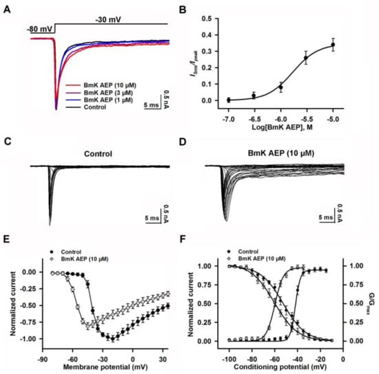 Influence of BmK AEP on voltage-gated sodium channel (VGSC) currents in primary cultured mouse cortical neurons. (A) BmK AEP inhibited the VGSC currents. Na+ currents were elicited by a 50-ms depolarization to −20 mV from the holding potential of −80 mV. (B) Concentration–response relationship of BmK AEP inhibition of Na+ currents. (C,D) Representative traces of Na+ currents in the absence and presence of 10 µM BmK AEP, respectively. Currents were triggered by 50-ms depolarizations from −100 to 30 mV in a 5-mV step. (E) Normalized peak current–membrane voltage (I–V) relationship of Na+ currents in the absence and presence of 10 µM BmK AEP. (F) Effect of BmK AEP (10 µM) on the steady-state activation and inactivation of VGSCs. Each data point represents the mean ± SEM (n = 5–8).
