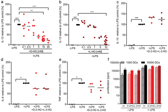 2-HG modulates LPS-stimulated cytokine secretion by DCs. Monocyte-derived DCs were plated in 6-well plates. DCs were activated with 100 ng/mL LPS and in parallel exposed to D-2-HG or L-2-HG for 24 h. Supernatants were collected and measured for IL-12 (a,b), IL-10 (c), IL-6 (d), and TNF (e). The measurements were performed by commercially available ELISA’s. Data represent the median of four independent experiments. Statistical analysis was tested using Dunnet’s multiple comparison test (* p ≤ 0.05, ** p ≤ 0.01, *** p ≤ 0.001). (f) Antigen presentation was analyzed in a mixed lymphocyte reaction. DCs were cultured in flasks in the absence or presence of LPS and 2-HG for 24 h, harvested, and cocultured with allogeneic T cells for another five days. Proliferation was determined by [3H]-thymidine incorporation.