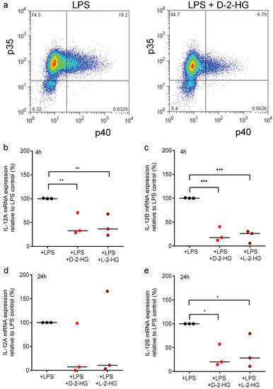 Next, we analyzed gene expression levels of the IL-12 subunits p35 (IL-12A) and p40 (IL-12B). LPS-stimulated DCs were treated with D-2-HG or L-2-HG for 4 or 24 h and gene expression was determined by RT-qPCR analysis. After stimulation with 100 ng/mL LPS, we detected a strong expression of IL-12A and IL-12B genes. Treatment with D-2-HG or L-2-HG significantly decreased expression after 4 h (Figure 3b,c); after 24 h the effect was no longer significant for IL-12A but was still significant for the expression of IL-12B (Figure 3d,e).