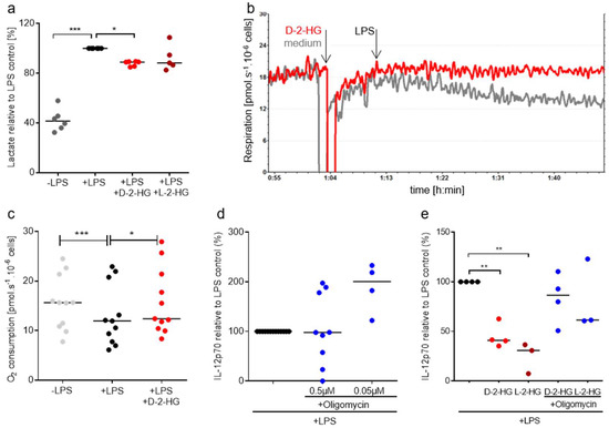 Oxygen consumption related to ATP production was also significantly reduced after LPS addition and this effect was prevented by the addition of D-2-HG. Furthermore, the capacity of the electron transfer system was higher in D-2-HG treated cells (data not shown). These data point towards reduced substrate flux into mitochondria upon stimulation with LPS, which was counteracted by D-2-HG. These results suggest that LPS stimulation shifts the metabolism of DCs from Oxidative phosphorylation (OXPHOS) to aerobic glycolysis. D-2-HG prevents these metabolic alterations, which might contribute to a reduced IL-12 secretion. To analyze whether the reduction in mitochondrial respiration is directly linked to IL-12 production, we inhibited mitochondrial activity by oligomycin and measured IL-12 secretion in DC supernatants. IL-12 production was positively affected by treatment with low concentrations (0.05 µM) of oligomycin (Figure 5d). A combination of D-2-HG and L-2-HG with low concentrations of oligomycin partially rescued IL-12 secretion (Figure 5e).
