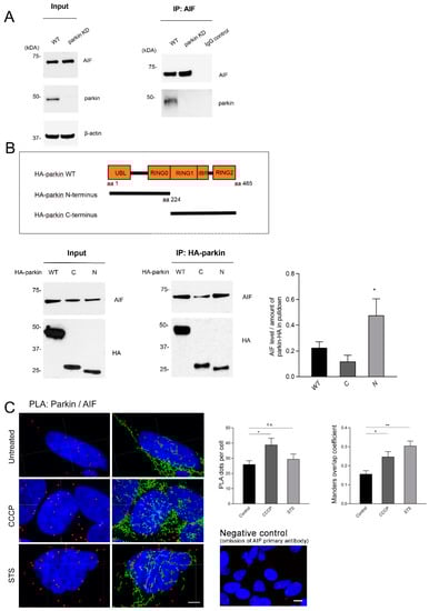 Parkin physically interacts with the apoptosis-inducing factor (AIF). (A) Whole-cell lysates of untreated SH-SY5Y cells with endogenous parkin levels (WT) and parkin knockdown (KD) were subjected to co-IP with an anti-AIF antibody, followed by Western blot (WB) of input and IP fractions with the indicated antibodies (the blots were probed consecutively with the antibodies). Rabbit IgG was used as negative control for the IP. Molecular mass markers are in kilodaltons (kDa). (B) Whole-cell lysates of HeLa cells transfected with HA-parkin (wild type, WT, C-terminal domain, C, N-terminal domain, N) were immunoprecipitated with an anti-HA antibody. WB analysis was performed with the indicated antibodies. Given the difference in expression levels of full-length HA-parkin and deletion mutants, a densitometric analysis of AIF relative to immunoprecipitated parkin is provided (mean ± SEM, n = 4). Two-tailed Student’s t-test for C- and N-terminal domains * p < 0.05. (C) SH-SY5Y cells were processed using the PLA to visualize and quantitatively assess the parkin-AIF interaction under normal culture conditions and after CCCP (10 µM, 3 h) or STS (2 µM, 3 h) treatment. The PLA signal is visualized as red dots, while DAPI-stained nuclei are shown in blue. The specificity of the PLA interaction was confirmed by performing the experiments with only one of the two primary antibodies. Exposure to CCCP increased the overall PLA signal indicating an augmented interaction between the two proteins; STS treatment did not result in a significant increase in the overall number of PLA dots per cell. A 3D reconstruction of a co-staining of the PLA signal for parkin and AIF with a mitochondrial marker (green fluorescent protein attached to a mitochondrial leading sequence, mito-GFP) was used to visualize the colocalization of the parkin–AIF complexes with the mitochondria. The colocalization was quantified by using the Manders’s overlap coefficient. Scale bar: 4 μm. * p < 0.05; ** p ≤ 0.01 compared to untreated control group (one-way ANOVA followed by Tukey’s post hoc test to correct for multiple comparisons). n.s.: not significant.