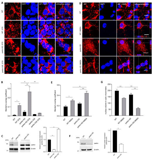 Parkin deficiency increases stress-induced translocation of AIF to the nucleus. (A) Representative images of AIF-nuclear colocalization in SH-SY5Y cells (WT, parkin KD, and parkin O/E) after STS treatment (3 h, 2 µM). Z stacks are provided to demarcate the nucleus. Scale bars: 5 μm. (B) The colocalization was quantified by using the Manders’s overlap coefficient for treated and untreated conditions. (C) Whole-cell lysates analyzed by WB show parkin levels for WT, parkin KD, and parkin O/E SH-SY5Y cells. Relative density values were normalized to the loading control β-actin. (D,E) Representative images of AIF nuclear translocation and its quantification in primary cortical neurons, WT (control shRNA), and parkin KD, after NMDA treatment (500 µM plus 10 µM glycin, 5 min). Scale bars: 10 μm. (F) Whole-cell lysates analyzed by WB show parkin levels in primary neurons, WT (control shRNA) and parkin KD. (G) Scoring of nuclear volume average. A lower average is indicative of more pyknotic nuclei present. Statistical differences of Mander’s overlap coefficients, nuclear volumes, and relative protein levels were calculated by one-way ANOVA followed by Tukey’s post hoc test to correct for multiple comparisons. For comparing only two groups a two-tailed Student’s t-test was used. Data are plotted as means ± SEM from three independent experiments (for IF, randomly chosen areas of at least two wells per condition). * p ≤ 0.05, ** p ≤ 0.01, *** p ≤ 0.001.