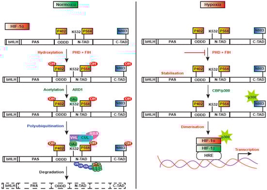 HIF-1 is a heterodimer consisting of two functional subunits—HIF-1α and HIF-1β (ARNT—aryl hydrocarbon receptor nuclear translocator) [12]. HIF-1α has an oxygen domain, which is highly regulated by oxygen concentration and has a short half-life (approximately 5 min) [23,27]. It controls the expression of a variety of genes that play crucial roles in acute and chronic adaptation to oxygen deficiency, such as erythropoiesis, glycolysis, angiogenesis, inhibition of apoptosis, and cell differentiation [28,29,30,31]. HIF-1α undergoes multiple modes of post-translational modifications during normoxia, as it is expeditiously downregulated in an oxygen-dependent manner. In normoxia (Figure 1), HIF-1α is rapidly degraded by the proline hydroxylases-pVHL-proteasome system, but during hypoxia, HIF-1α is stabilized and translocated into the nucleus, where it dimerizes with HIF-1β and forms a transcriptionally active HIF complex [32,33]. The proteostasis of HIF-1α is critically regulated by ubiquitination mediated by the protein von Hippel-Lindau (pVHL). It directly binds to the oxygen degradation domain of HIF-1α facilitated by prolyl-4-hydroxylase (PHD), which hydroxylates two specific proline residues—Pro402 and Pro564—in humans [34,35]. VHL recruits a ubiquitin ligase protein complex consisting of elongin B, elongin C, and cullin, which ultimately results in ubiquitination and degradation of HIF-1α by the 26S proteasome [36,37]. PHDs are dioxygenases that require molecular oxygen, Fe2+, and 2-oxoglutarate as substrates [38]. Among the four identified PHDs that have distinct functions, PHD2 is found to be the critical oxygen sensor that maintains steady-state levels of HIF-1α under normoxia. Thus, PHDs provide HIF-dependent auto-regulatory mechanisms driven by oxygen concentrations (Figure 2).