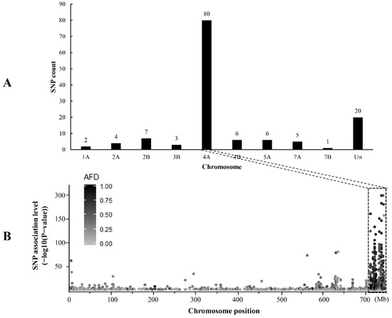 Number of polymorphic single nucleotide polymorphism (SNP) distributed on different wheat chromosomes (A) and distribution of SNP variants on chromosome 4A (B).