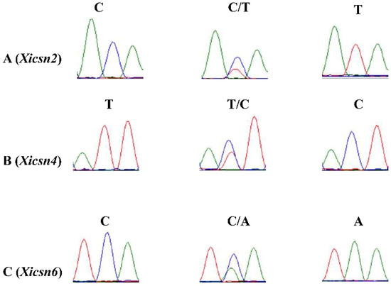 Sanger sequencing profiles of SNP markers Xicsn2 (A), Xicsn4 (B) and Xicsn6 (C) in the homozygously resistant (R), homozygously susceptible (S), and heterozygous F2:3 lines (H) from the mapping population of the Xuxusanyuehuang × Zhongzuo 9504 cross. Blue, green, and red lines represent bases of cytosine (C), adenine (A), and thymine (T), respectively.