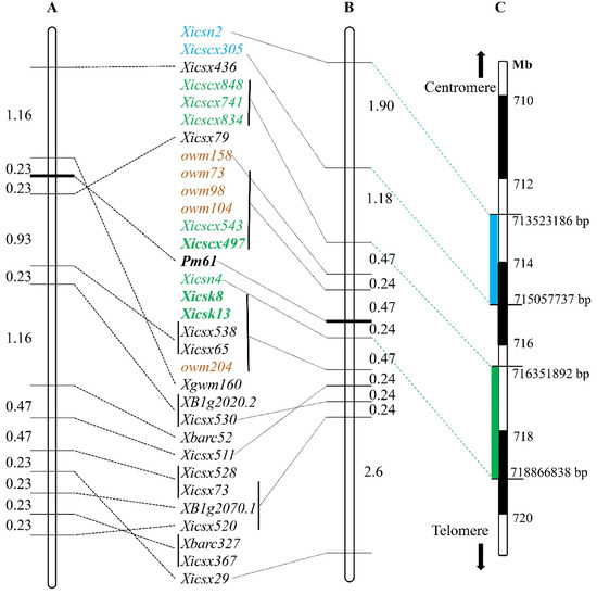 Genetic linkage maps of Pm61 in previous study [35] (A) and newly developed in the present study (B). The positions of the Pm61-linked molecular markers are indicated on a scale bar based on the Chinese Spring genome sequence (C).
