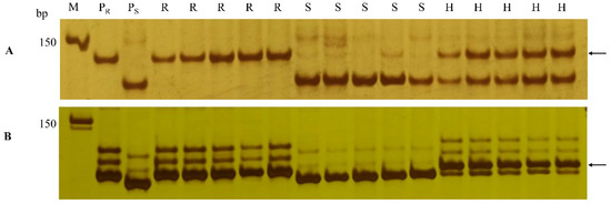 The leaf tissues of each F2:3 line were used for DNA extraction after disease resistance test following the CTAB protocol [44]. DNA concentration was determined using the Napdrop One (Thermo Fisher Scientific Inc, Madison, WI, USA) and was adjusted to 50 ng·mL−1. DNA bulks with resistant or susceptible phenotype were constructed by pooling equal amounts of DNA from 10 resistant and susceptible F2:3 lines each. DNA was amplified in a Biometra T3000 Thermocycler (ABI, New York, NY, USA). Each reaction mixture (10 μL) was composed of 5 μL mixture (including Taq polymerase, dNTPs, and 10× PCR buffer and Mg2+), 2 μL ddH2O, 1 μL DNA, and 1 μL 10 μM each of the forward and reverse primers. The profile of DNA amplification was set at 98 °C for 3 min; 35 cycles of 98 °C for 10 s, 55 °C–60 °C (depending on the specific primers) for 10 s and 72 °C for 25 s; 72 °C for 10 min. Products amplified were separated by 2% agarose gel or 8% non-denaturing polyacrylamide gel (Acr:Bis = 29:1).