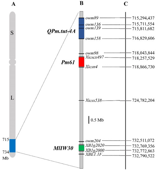 Three Pm genes or QTL, i.e., MlIW30, Pm61, and QPm.tut-4A, have been detected on a 17.50 Mb genomic region on the terminal part of chromosome arm 4AL (Figure 7). Based on their positions in the Chinese Spring reference genome, MlIW30 was located in a 21 kb (732,769,506–732,790,522) genomic interval [36]. QPm.tut-4A was identified in a 1.54 Mb (715,294,437–716,829,606) genomic interval. MlIW30 and QPm.tut-4A were transferred into common wheat from the wild emmer (T. turgidum ssp. dicoccoides) and T. militinae, respectively [36,37]. Pm61 is derived from a Chinese landrace and is located in a 0.61 Mb (718,257,529–718,866,730) genomic interval between MlIW30 and QPm.uga-4A. It appears that Pm61 was located on different genomic intervals as MlIW30 and QPm.tut-4A. Isolation and functional analysis of these Pm genes will ultimately understand their relationship.