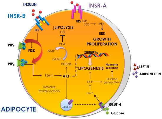 AT is formed at specific times and locations. Once formed, the tissue retains dynamicity, responding to homeostatic and external signals and being capable of a 15-fold expansion [25]. Adipose-derived stem cells (ASCs) are the principal components of AT involved in homeostatic maintenance and tissue development, and they are highly responsive to insulin. AT development and expansion occurs both through the differentiation of ASCs into adipocytes and through the storage of lipids, and insulin participates in these processes by stimulating both adipocyte hypertrophy (or lipogenesis) and hyperplasia (or adipogenesis). The level of activation of each of these two responses varies depending upon genetic background, modifier effects, diet, biological and hormonal milieu and the anatomical site of fat. Early studies identified insulin to be an inducer of preadipocyte differentiation [26], even though this effect was traditionally attributed more to the activation of the insulin-like growth factor-I receptor (IGF-IR) than INSR [27] with supraphysiological concentrations of insulin, also considering the relatively high expression of IGF-IR compared to INSR in preadipocytes [28]. Indeed, the INSR plays a fundamental role in stem cell commitment to adipogenesis during embryogenesis. In a mouse model of INSR knock-out, induced pluripotent stem cells subjected to a protocol of adipocyte differentiation yielded a poor differentiation as compared to the control cells in terms of lipid droplet accumulation and specific gene expression [29]. These findings are consistent with the report from Boucher et al., that the INSR has a crucial role in the control of AT development [30]. However, the effects of insulin on human adipocyte maturation seem to be prevalent in the late phases of adipogenesis. In both the early and intermediate phases of adipogenesis, the expression levels of adipogenic markers in human ASCs undergoing differentiation without insulin were comparable to those in ASCs differentiated with insulin, while in the late phase of differentiation, the contribution of insulin was found to be essential to achieve a completely functional adipocyte phenotype [19].
