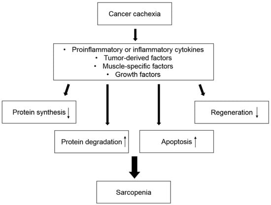 In cancer cachexia, various factors, including tumor-derived factors and cytokines, induce sarcopenia due to decreased protein synthesis and increased protein degradation. Moreover, a recent study indicated that increased ROS production, which can be derived from increased lipolysis and excessive fatty acid oxidation, can damage mitochondria in skeletal muscle cells and induce sarcopenia in cancer cachexia []. In this section, we summarize the metabolic and molecular backgrounds of sarcopenia associated with cancer cachexia.
