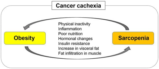 Sarcopenic obesity, which is characterized by low skeletal muscle mass and high adiposity, is considered as the “worst-case scenario” because it includes two adverse conditions: Sarcopenia and obesity. Sarcopenic obesity is related to markedly high morbidity and mortality rates in various diseases []. Sarcopenia and obesity generally have several etiologies, including physical inactivity, poor nutrition, inflammation, and insulin resistance. Sarcopenia and obesity can interplay and exacerbate each other [] (Figure 3). Obesity increases insulin resistance, which promotes skeletal muscle depletion []. Moreover, obesity increases fat infiltration in skeletal muscle tissues, leading to poor physical function and performance []. Meanwhile, sarcopenia impairs physical activity and function, worsening obesity. Severely obese patients tend to develop sarcopenic obesity as a result of cancer cachexia; although the loss of adipose tissue mechanistically precedes skeletal muscle depletion in cancer cachexia, skeletal muscle depletion progresses in the process of lipolysis of excessive adipose tissues [].