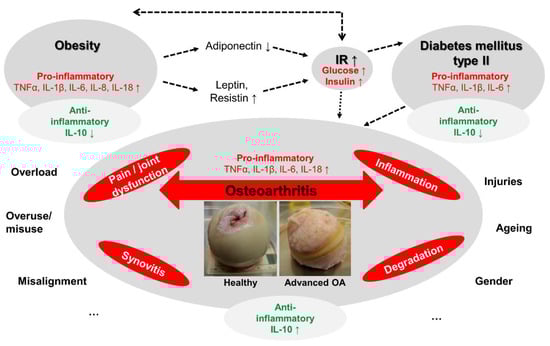 - Schwarz, S.; Mrosewski, I.; Silawal, S.; Schulze-Tanzil, G. The interrelation of osteoarthritis and diabetes mellitus: Considering the potential role of interleukin-10 and in vitro models for further analysis. Inflamm. Res. 2018, 67, 285–300. [Google Scholar] [CrossRef] [PubMed]