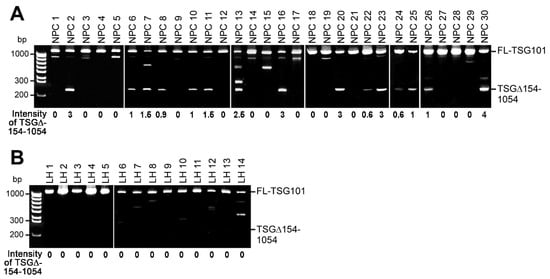 The TSG∆154-1054 mRNA variant is detected predominantly in nasopharyngeal carcinoma (NPC) but not in normal lymphoid hyperplasia (LH). (A,B) RT-nested-PCR detection of constitutively spliced full-length TSG101 mRNA (FL-TSG101) and aberrantly spliced TSG101 mRNA (TSG∆154-1054) in biopsies of NPC and control LH. The RT-nested-PCR products were analyzed by agarose gel electrophoresis and the quantified intensity of the TSG∆154-1054 mRNA variant is indicated.