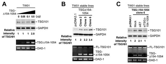 The ectopic expression of TSG∆154-1054 increased levels of TSG101 protein. (A) Expression of TSG101 protein in TW01 cells transfected transiently with TSG∆154-1054 plasmid. Upper panel: Protein lysates were analyzed by immunoblotting with anti-TSG101 and anti-GAPDH antibodies (control). The quantified intensity of TSG101 protein relative to ‘0 µg’ TSG∆154-1054 in the left lane is indicated, after normalizing with the intensity of the corresponding GAPDH internal control. Lower panel: Total RNAs were analyzed by RT-nested-PCR to detect TSG∆154-1054 mRNA. An RT-PCR detecting DAD-1 was performed as a control to verify equal input of cDNA templates. (B) Expression of TSG101 protein in TW01 cells (clones 2, 3, 6) stably expressing TSG∆154-1054 and cells expressing empty pcDNA3.1 vector as control. Upper panel: Immunoblotting to analyze TSG101 protein. The quantified intensity of TSG101 protein relative to control pcDNA3.1 is indicated after standardizing with the intensity of control GAPDH. Lower panel: RT-nested-PCR to analyze FL-TSG101 and TSG∆154-1054 mRNAs with DAD-1 as control. (C) Effect of TSG∆154-1054 knockdown on the expression levels of TSG101 mRNA and protein. siTSG∆154-1054 is the targeted siRNA and siE7 is an irrelevant siRNA control. Immunoblotting and RT-nested-PCR were performed as in panels (A,B).