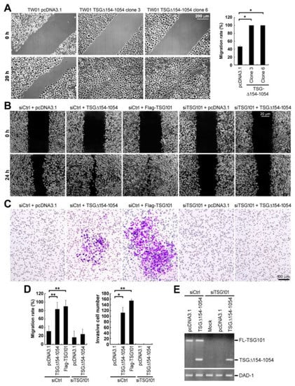 Subsequently, we checked the invasive capacity of these cells by a transwell invasion assay. The ectopic expression of TSG∆154-1054, as well as TSG101, induced the invasiveness of TW01 cells through Matrigel-coated membranes (Figure 5C,D right graph). However, the depletion of TSG101 by TSG101-specific siRNA (siTSG101) fully reduced the invasive potential of TSG∆154-1054-expressing cells in parallel with a loss of migration (Figure 5B–D). The full depletion of TSG101 and the expression of TSG∆154-1054 were clearly verified by RT-nested PCRs, which specifically detect both full-length TSG101 and the shorter splice variant TSG∆154-1054 (Figure 5E).