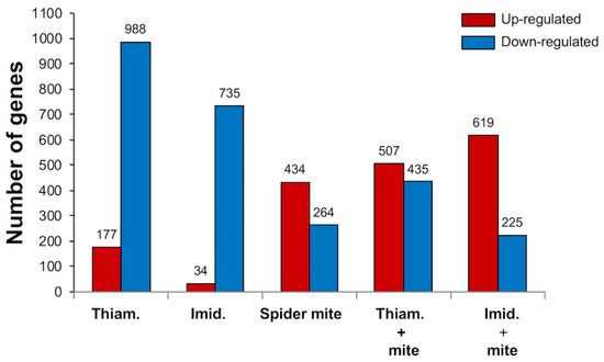 A total of 4418 differentially expressed genes (DEGs) were recovered, and 60% of them were down-regulated. Neonicotinoid insecticide exposure in the absence of spider mites suppressed the highest number of genes, with 988 and 735 genes down-regulated in response to thiamethoxam and imidacloprid, respectively (Figure 1). A relatively low number of genes were up-regulated in these plants, 177 for thiamethoxam- and 34 for imidacloprid-treated soybean. On the other hand, exposure to spider mite herbivory alone elicited a general induction of genes, with 434 transcripts up-regulated and 264 genes suppressed. Similarly, the majority of genes differentially expressed in plants exposed to neonicotinoids and spider mites were up-regulated, albeit soybean treated with thiamethoxam maintained a relatively high number of suppressed genes. These plants downregulated 435 transcripts and induced 507 genes. It is noteworthy that imidacloprid exposure and spider mite herbivory elicited the highest number of up-regulated DEGs, 619, while only 225 genes were suppressed.