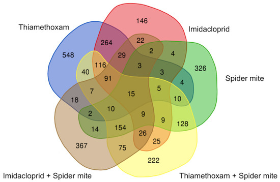 Venn diagram representing overlap in DEGs across treatments and DEGs unique to each of the treatments. DEGs were compared among soybean plants exposed to thiamethoxam, imidacloprid, spider mites, and the combination of either neonicotinoid insecticide and spider mites. All overlapped and unique DEGs are presented in the diagram.