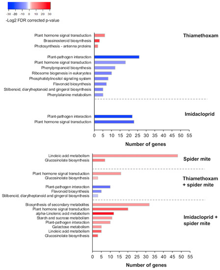 Pathways enriched in DEGs from soybean plants in response to thiamethoxam, imidacloprid, spider mite, and the combination of both insecticides and spider mites. Enriched pathways were selected based on an FDR corrected p-value < 0.05. Color of the bars refers to the −log2 corrected p-value of the respective enrichment pathway, red colored bars up-regulated genes, and blue colored bars indicate down-regulated genes. Length of the bar refers to the number of genes within the respective pathway, and the darker the color, the higher statistical significance.