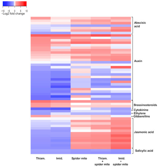 Further, auxin, a plant hormone involved in regulation of plant growth [44] as well as plant defense [42,45], appeared to be strongly affected by treatments as well (Figure 4, Supplementary File 2). Both insecticides alone had a similar effect on genes involved in auxin signaling, with roughly half of the differentially expressed transcripts up-regulated and half of them down-regulated. Notably, imidacloprid and thiamethoxam treatments resulted in the suppression of three auxin-responsive protein SAURs (Small Auxin Up RNA), that are involved in several aspects of plant growth and development [46]. These genes, on the other hand, were up-regulated in plants exposed to spider mites alone or in a combination of either insecticide. Moreover, three genes in the brassinosteroid (BR) biosynthesis pathway that is involved in the induction of various detoxifying genes against pesticides [47,48] were strongly up-regulated in thiamethoxam treated plants.