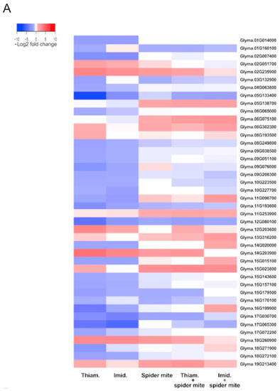 Genes associated with a number of plant hormones were significantly affected by both insecticides alone and in combination with the herbivore (Figure 4, Supplementary File 2). Most notable of these were JA and SA, which play critical roles in plant–insect and plant–pathogen interactions. Exposure to either insecticide significantly suppressed genes associated with both of these plant hormones. For example, MYC2 (Glyma. 09G204500) transcription factor involved in the JA pathway and JA-mediated resistance to insect pests [40,41,42] was down-regulated following imidacloprid exposure. Spider mite herbivory, in turn, induced genes involved in the JA pathway, which were even further up-regulated in plants exposed to spider mites and treated with imidacloprid. Moreover, all treatments had a suppressive effect on genes involved in the SA pathway. For example, Glyma.15G062500, which codes for Pathogenesis-Related Protein 1 (PR-1) involved in plant immune signaling and defense responses against herbivores [43] was down-regulated in soybean plants treated with either insecticide and exposed to spider mites alone or in combination with the neonicotinoids. It is noteworthy that spider mite herbivory suppressed SA-related genes while inducing JA-associated genes, a cross-talk effect between these two hormones common in plant–herbivore interactions [28,29]. Moreover, imidacloprid in combination with spider mite herbivory had the most robust effect on the induction of transcripts associated with the JA pathway.