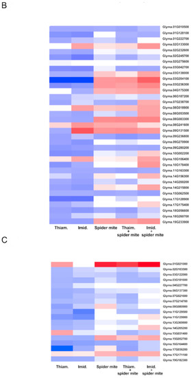 Heat map of DEGs involved in cell wall biosynthesis and metabolism (A), plant–pathogen interactions pathway (B), and phenylpropanoid biosynthesis pathway (C) in soybean exposed to thiamethoxam, imidacloprid, spider mites, and the combination of either neonicotinoid insecticide and spider mites. The color key represents log2-transformed fold change; red bars indicate induction of expression, while blue bars represent a decrease in expression.