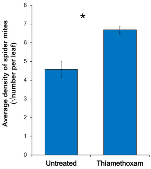 Soybean plants were grown from thiamethoxam-treated treated and untreated seeds as described above. Plants were maintained in mesh insect cages (60 × 60 × 60 cm, Bug Dorm, BioQuip Products, Rancho Dominguez, CA, USA), four plants per cage. All plants were contained within cages from germination until the end of the experiments. Spider mites (T. cinnabarinus) used in the experiment were obtained from a colony maintained on soybeans for at least three generations. When plants were at V3 stage (first three trifoliate leaves fully developed, approximately 2 wk following germination) 20 adult females of T. cinnabarinus were moved onto three fully expanded leaves of each plant using a fine paintbrush. Spider mites were allowed to colonize and reproduce on the plants for three wk, and plants were destructively sampled at the end of the experiment. Each soybean leaf was excised, and mites were brushed off onto a glass disk using a mite brush (Model 2836M, BioQuip Products, Rancho Dominguez, CA, USA), and counted using a dissecting microscope (Leica EZ4 HD, North Central Instruments, Plymouth, MN, USA). An average density of spider mites was calculated per leaf. Each treatment (thiamethoxam present/absent) was replicated 20 times, and each plant was considered a replicate. Data were transformed (square root) to meet assumptions of normal distribution and homogeneity of variance and analyzed using one-way analysis of variance with treatment as a fixed effect [88].