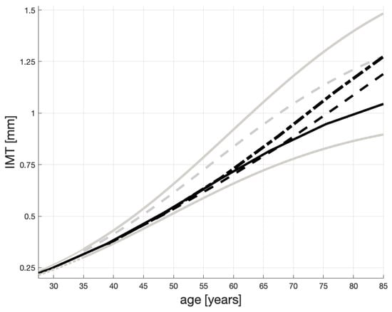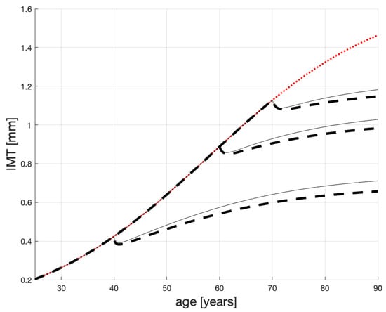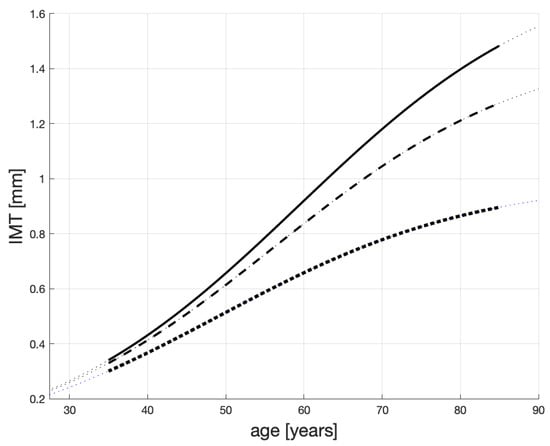The dashed line represents the IMT progression for patients, who are not healthy but not necessarily are “heavy” sufferers. Their plaque increases approximately 0.021 mm/yr between they are 40 and 60 years old and their IMT may reach 1.5 mm. The other parameters are as for the other lines. We contend that the speeds of the IMT growth reported above, and shown in Figure 1, correspond to those reported in [10,54,55]. In particular, the progression of IMT is documented to accelerate exponentially with age to the eighth decade of life, and slowing in the ninth decade of life (see [54,55]). Another study, [10], proposes a linear correlation between IMT and age, which we think cannot apply to the full age domain. To us, all this points to a logistic model.