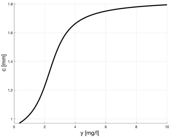 To calibrate the mapping f we need to remember that approximates the largest plaque thickness, here assumed 1.8 and that should be close to 1. The sole value of represents some nominal terminal plaque thickness, which can be augmented (respectively, diminished) by non-healthy levels of hsCRP (respectively, healthy). Figure 2 shows the proposed relationship between y and c which by and large fulfills these conditions. Here, , and .